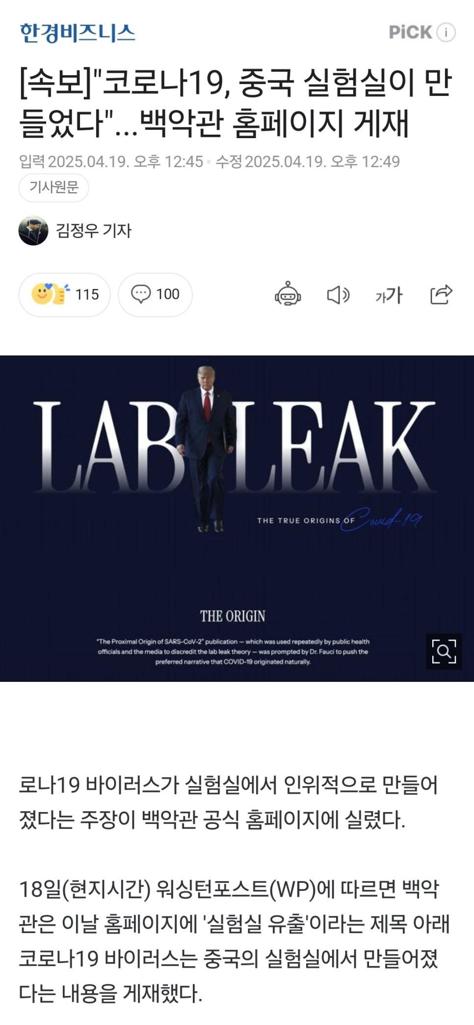 속보, 우한 코로나 중국 실험실에서 만들었다. 백악관 홈페이지 게재 rh1 0 94 0 2025.04.19 16:00 https://n.news.naver.com/article/050/0000089532?type=breakingnews&cds=news_edit중국에서 만든 것 중 유일하게 성공한 건 우한 코로나 0
