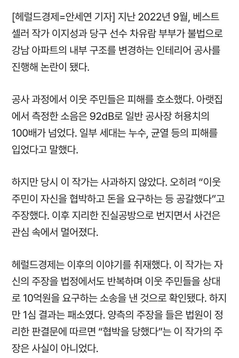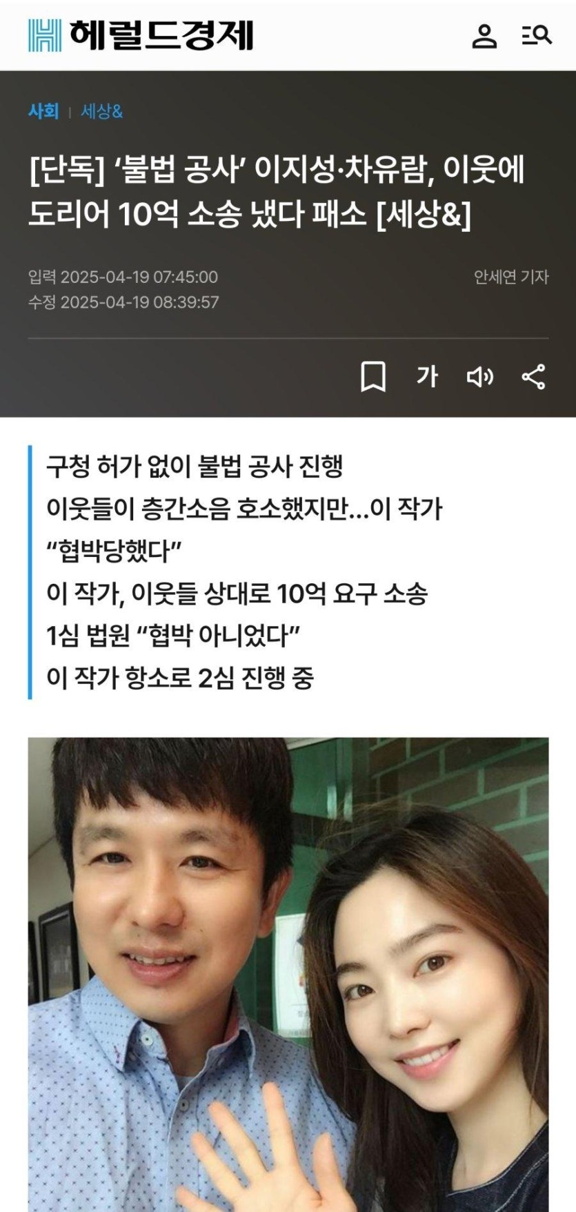 차유람, 불법공사 '이웃에 10억 소송 패소'