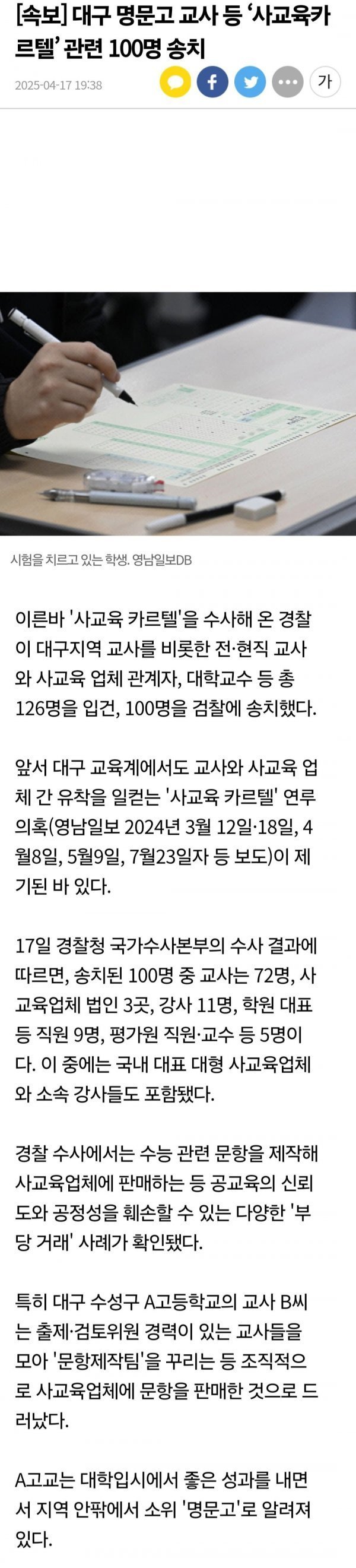 대구 명문고 교사 등 '사교육 카르텔' 관련 100명 검찰에 송치