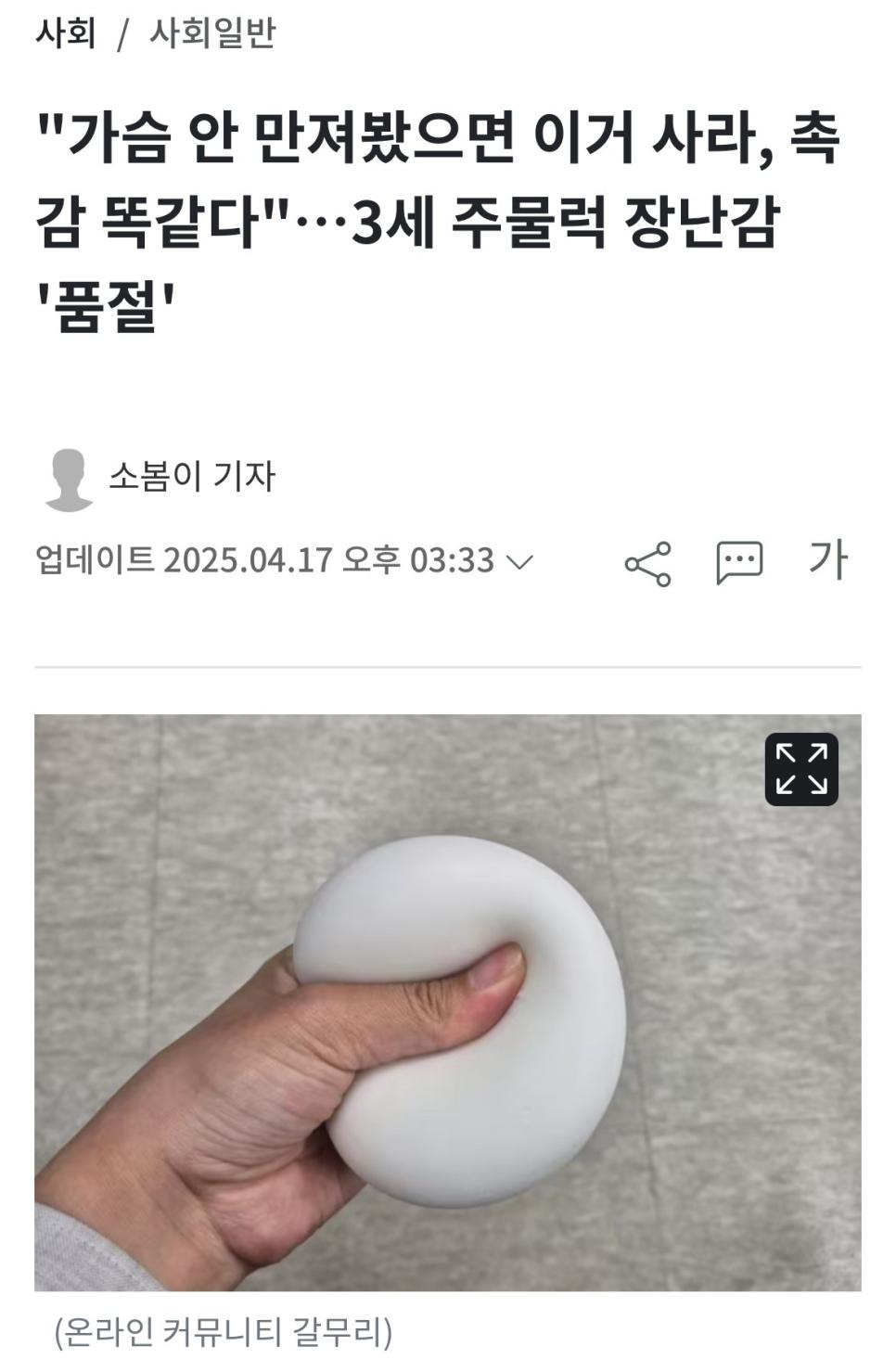 "가슴 안 만져봤으면 이거 사라, 촉감 똑같다"…3세 주물럭 장난감 '품절' rh1 0 93 0 2025.04.17 19:30 "가슴 안 만져봤으면 이거 사라, 촉감 똑같다"…3세 주물럭 장난감 '품절' 원문글https://www.fmkorea.com/8263515911 0