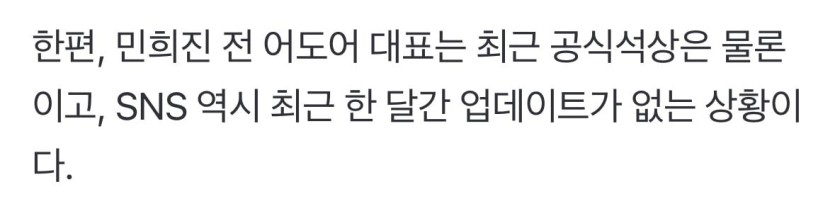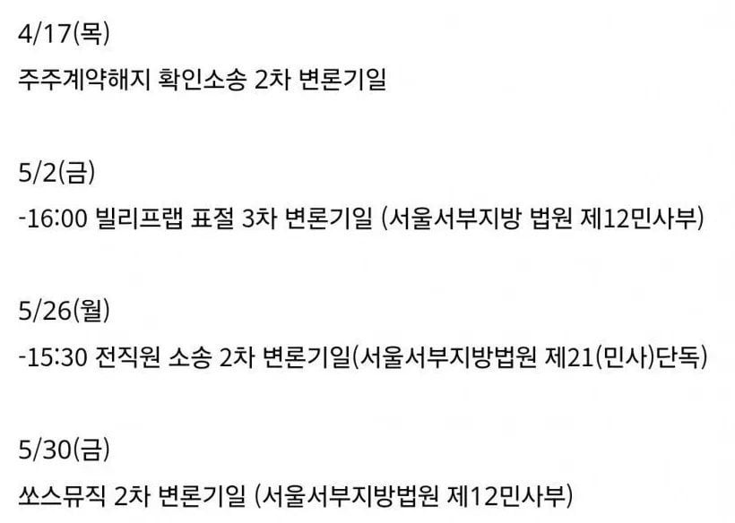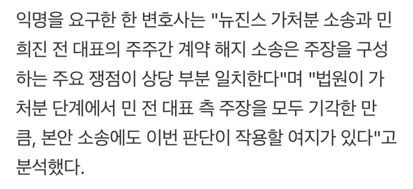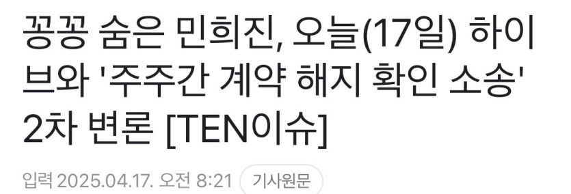 꽁꽁 숨은 민희진, 오늘(17일) 하이브와 '주주간 계약 해지 확인 소송' rh1 0 137 0 2025.04.17 17:00 https://naver.me/IxsolN0t 언젠가부터 뉴진스만 보이던 상황에서 드디어 나타난 본체 오늘 하이브와의 재판 이후에도, 빌리프랩 > 어도어 전직원 > 쏘스뮤직이 대기표 뽑고 기다리는 중 0