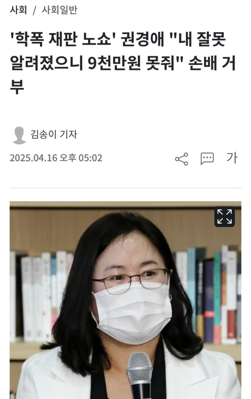 '학폭 재판 노쇼' 권경애 "내 잘못 알려졌으니 9천만원 못줘" 손배 거부 rh1 0 106 0 2025.04.17 14:00 학교폭력 소송에 출석하지 않아 패소 확정판결을 받게 만들었던 권경애 변호사가 언론 보도를 이유로 유족에게 주기로 했던 위자료 지급을 거부했다.유튜브가면 똑같은 뉴스영상 5개정도 있을꺼니까거기가서 댓글을 달아요 0