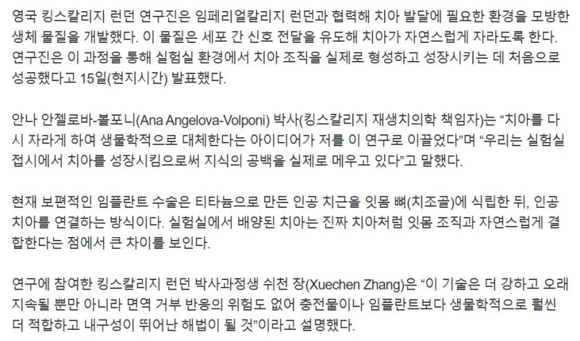 내 치아 세포를 배양해 치아 뿌리에 심어서 자연스럽게 자라거나