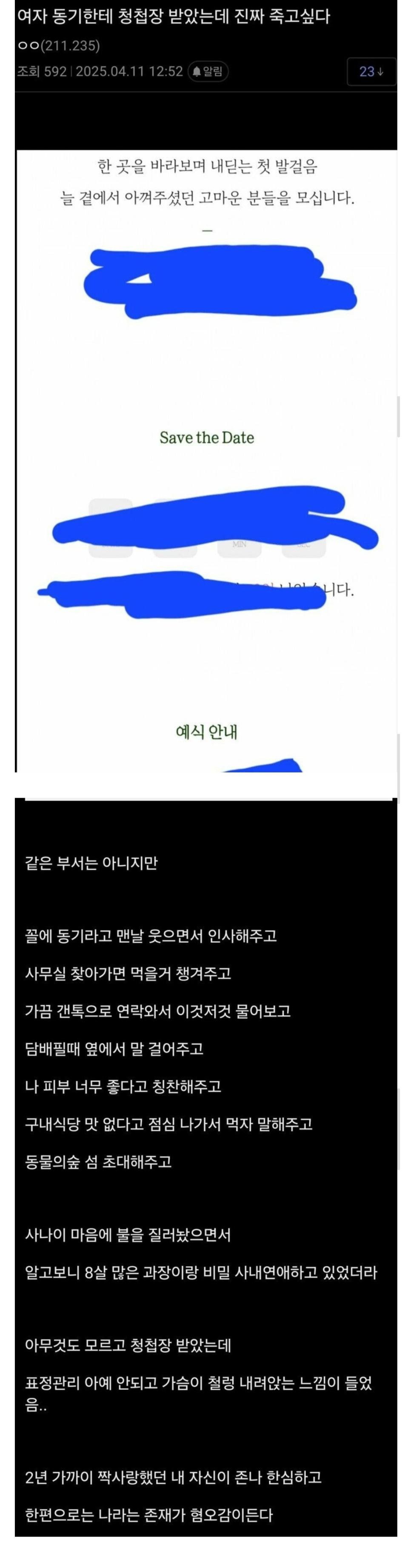 여자 동기한테 청첩장 받고 죽고싶다는 중소기업남 ㄷ.Jpg