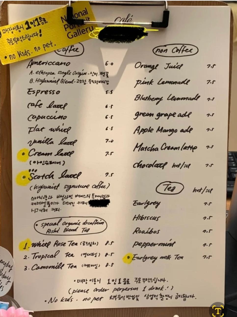 킹받는다는 영어 메뉴판 ㄷㄷ.jpg rh1 0 92 0 2025.04.15 21:45 킹받 포인트1. 필기체와 정자 왔다갔다 함 특히 l, e, t 골때림2. 대문자와 소문자 지맘대로 왔다갔다 함3. "iced"가 아닌 "ice"4. order perperson 1 drink 라는 말도 안되는 문법5. 1인 1음료는 칼같이 한국어로 써놓음 0