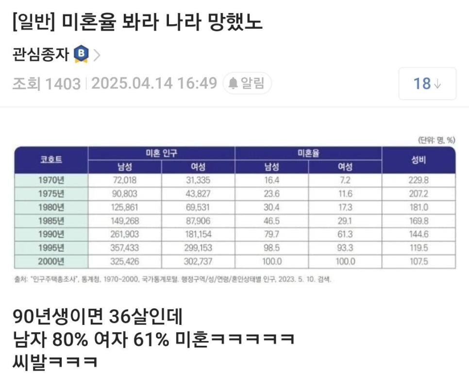 와 한국 미혼율 봐라 ㄷㄷㄷㄷ