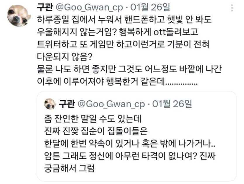 집순이, 집돌이들은 정신에 아무런 타격이 없나요?