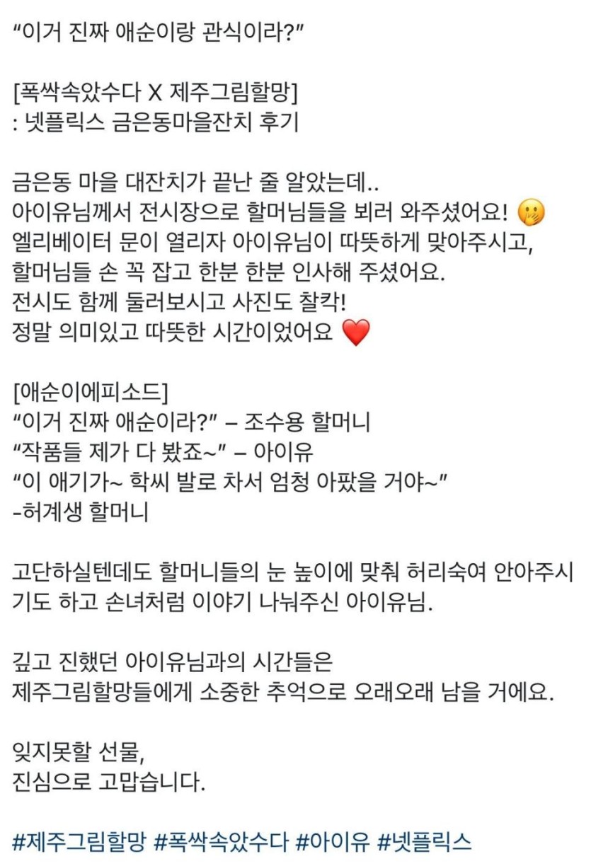 폭싹 속았수다 이벤트 후 제주 그림 할머니들 만난 아이유