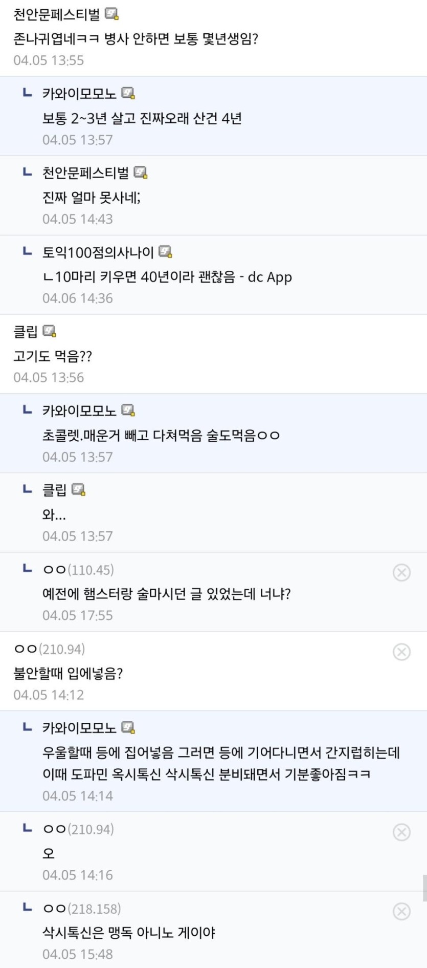싱글벙글 10년넘게 햄스터 키우는(?) 디씨인....jpg rh1 0 120 0 2025.04.13 14:30 햄스터 뚜따게이였음 ㅋㅋㅋ+++++ 막걸리도 먹이고 아주 그냥 막 키움 ㅋㅋㅋㅋ(햄스터는 알콜에 대한 내성이 인간보다 훨씬 강해서 큰 문제 없다고 함) 0