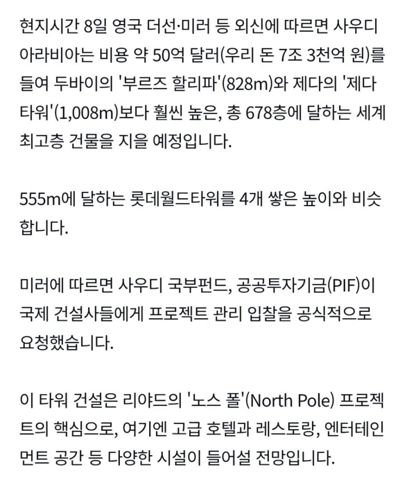 '롯데타워 4배 높이' 사우디 2000m 타워 건설 계획 rh1 0 220 0 2025.04.12 16:15 ㅎㄷㄷㄷ 진짜로 완공되면 말그대로 구름위를 구경할수도 있겠네요 '롯데타워 4배 높이' 사우디 2000m 타워 건설 계획 0