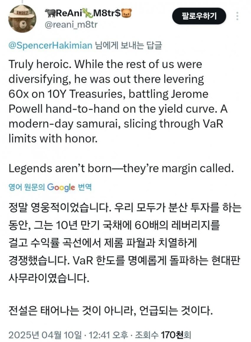일본 60배 레버리지 반응 개웃기네 ㅋㅋ rh1 0 91 0 2025.04.12 15:15 현대판 사무라이전설은 태어나는게 아니라 그들의 마진콜이다ㅋㅋ사무라이의 엔딩이 할복이였네 0