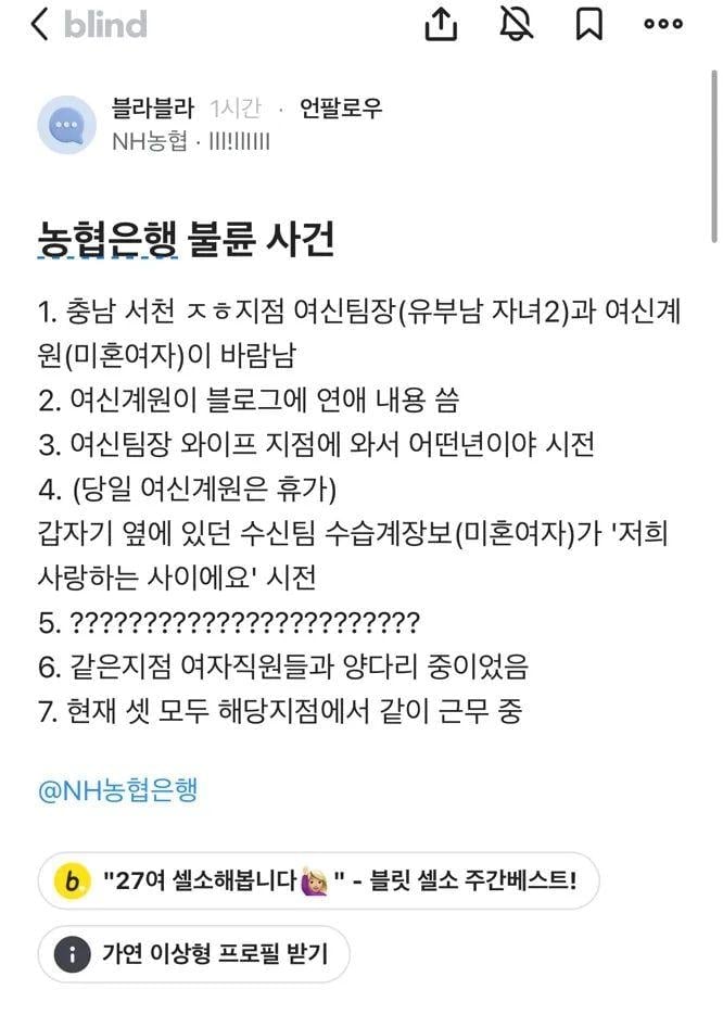 오늘도 평화로운 농협은행 레전드 불륜 사건 ㄷㄷ