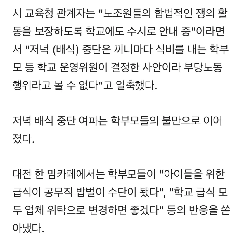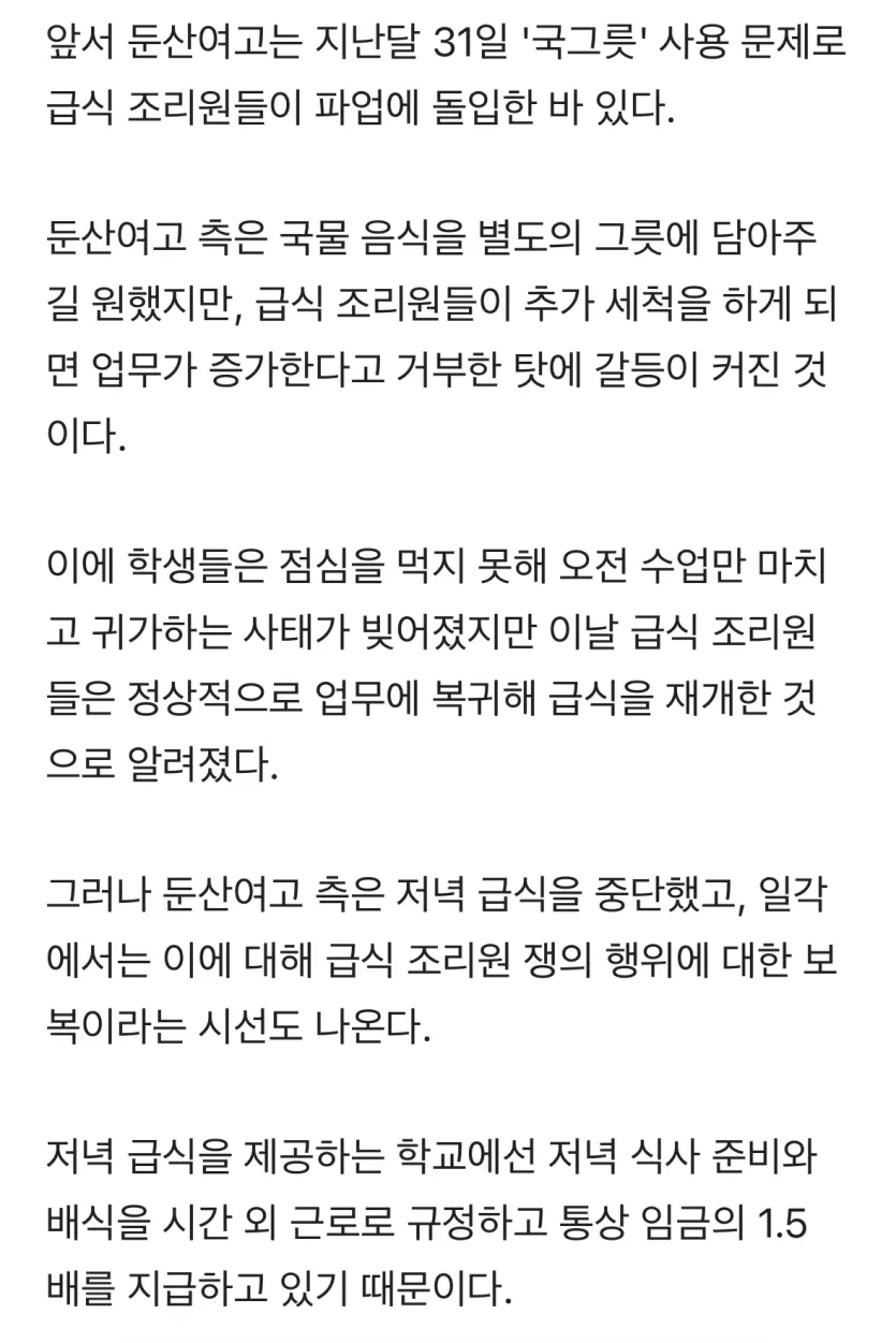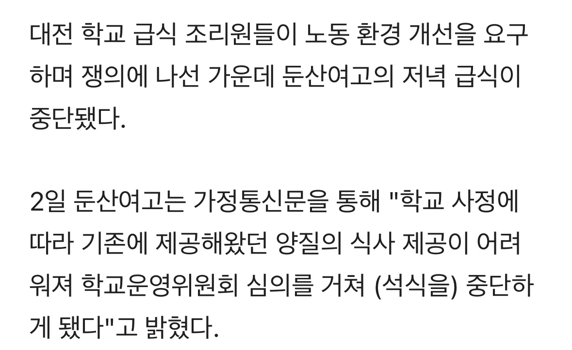 둔산여고 저녁 급식 중단…학교·조리원 갈등 심화