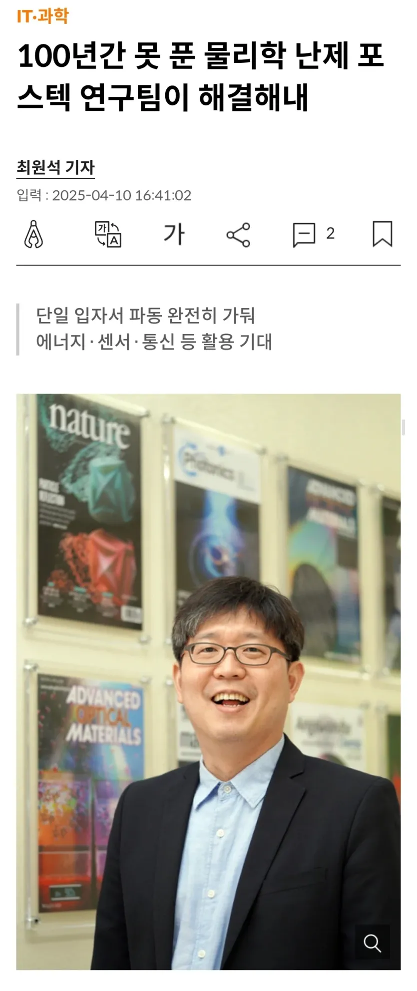 100년간 못 푼 물리학 난제 해결한 포스텍 연구팀 rh1 0 100 0 2025.04.11 22:15 https://m.mk.co.kr/news/it/11288273 PRL은 물리학계에서 가장 권위있는 학술지 중 하나 100년간 못 푼 물리학 난제 해결한 포스텍 연구팀 0