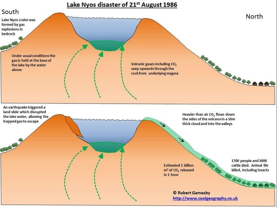 한 마을의 모든 동물이 전멸했던 사건.jpg rh1 0 91 0 2025.04.11 10:15 니오스 호의 비극1986년 8월 3일 카메룬의 한 화산에서 엄청난 양의 이산화탄소가 뿜어져 나옴그 결과 화산 주변에 있던 인간 1746명을 포함해서 산소로 호흡하던 모든 동물들은 전부 질식사한 사건시체에는 파리 조차 안꼬였다 함왜냐면 파리도 질식사해서... 0