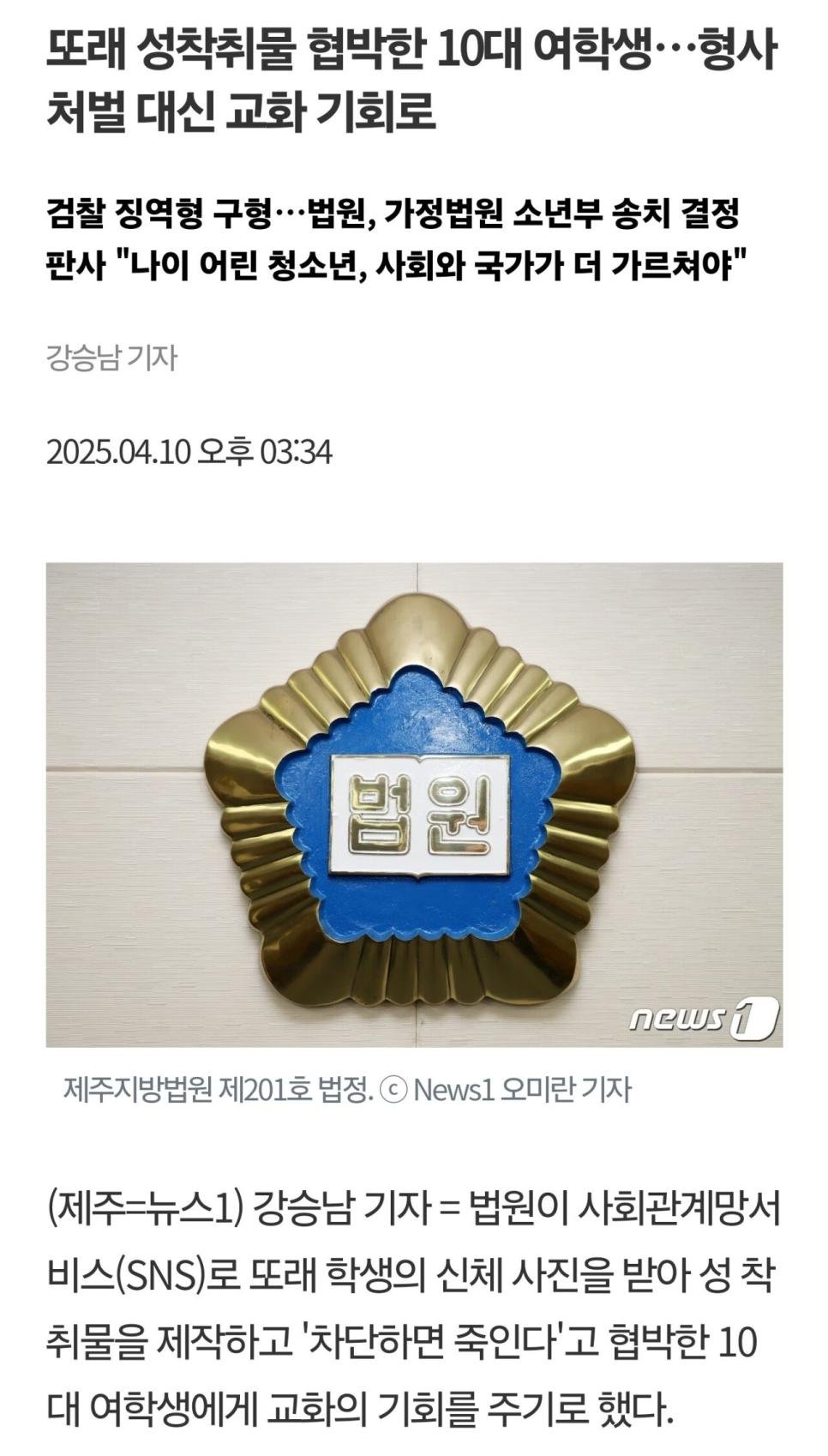 또래 성착취물 협박한 10대 여학생. 형사처벌 대신 교화 기회로