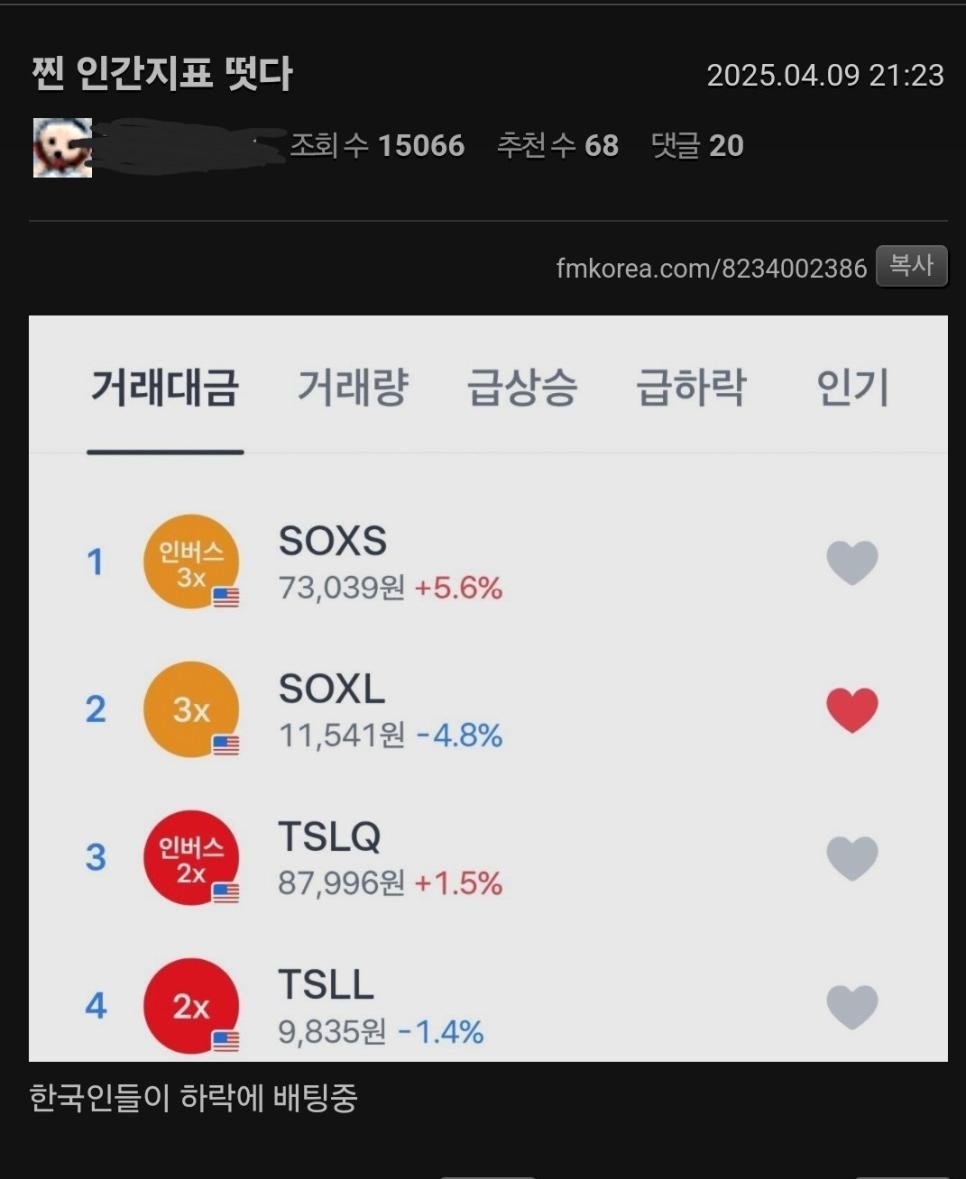 밤사이 미국주식판에 벌어졌던 멸망전 rh1 0 91 0 2025.04.11 00:15 미국 반도체 3배 etf 하락 베팅 vs 상승 베팅 3배 레버리지가 쌍으로 거래대금 1, 2등 찍음 한쪽은 한강뷰고 한쪽은 한강in인 베팅 그 결과 . . . 단 하루만에 하락에 베팅한 쪽이 멸망함 저 하락을 매꿀려면 130% 상승해야 50% 하락분 매꿈 0