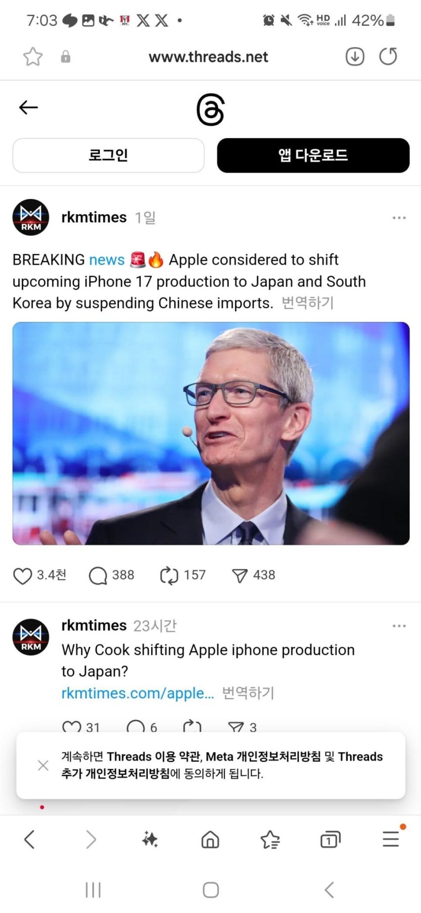 [속보] 애플, 아이폰 생산시설 중국에서 한국으로 이전하는것 검토중