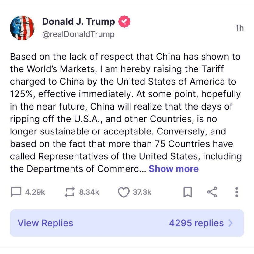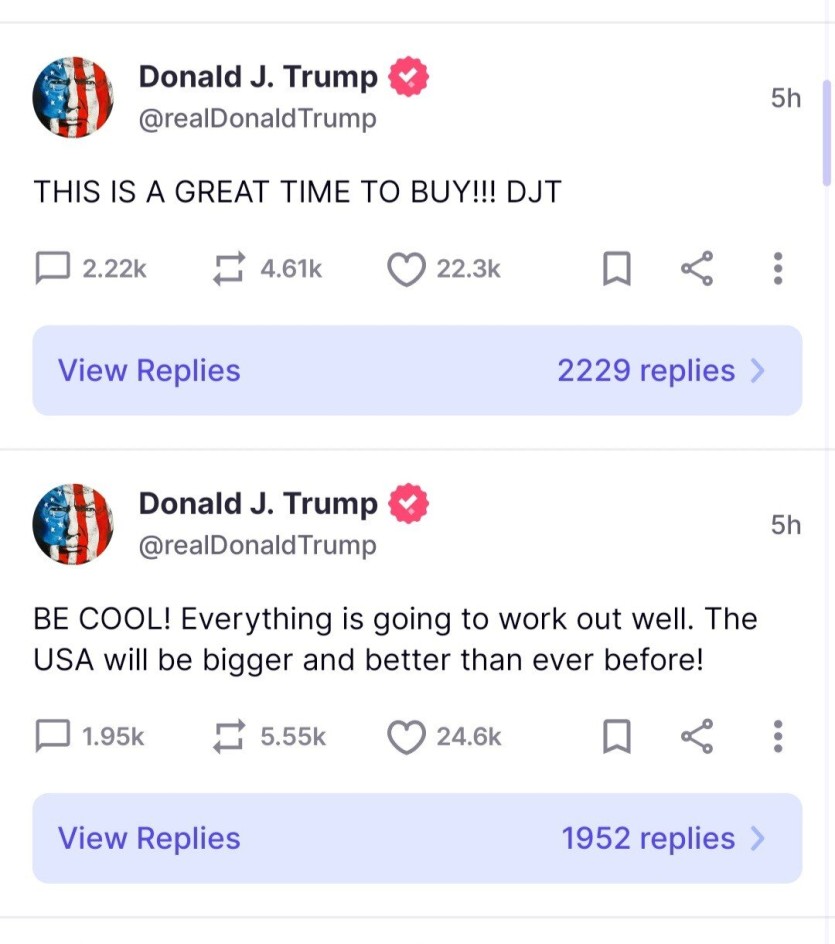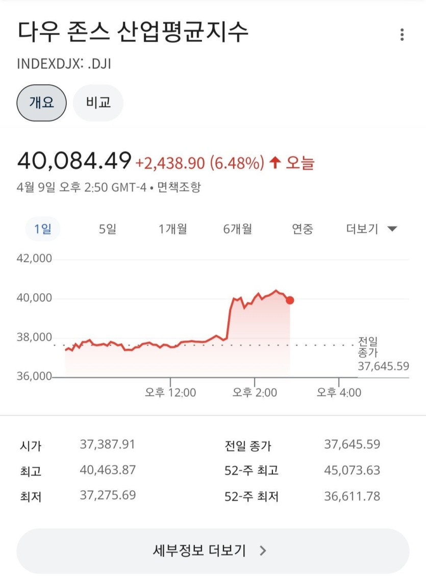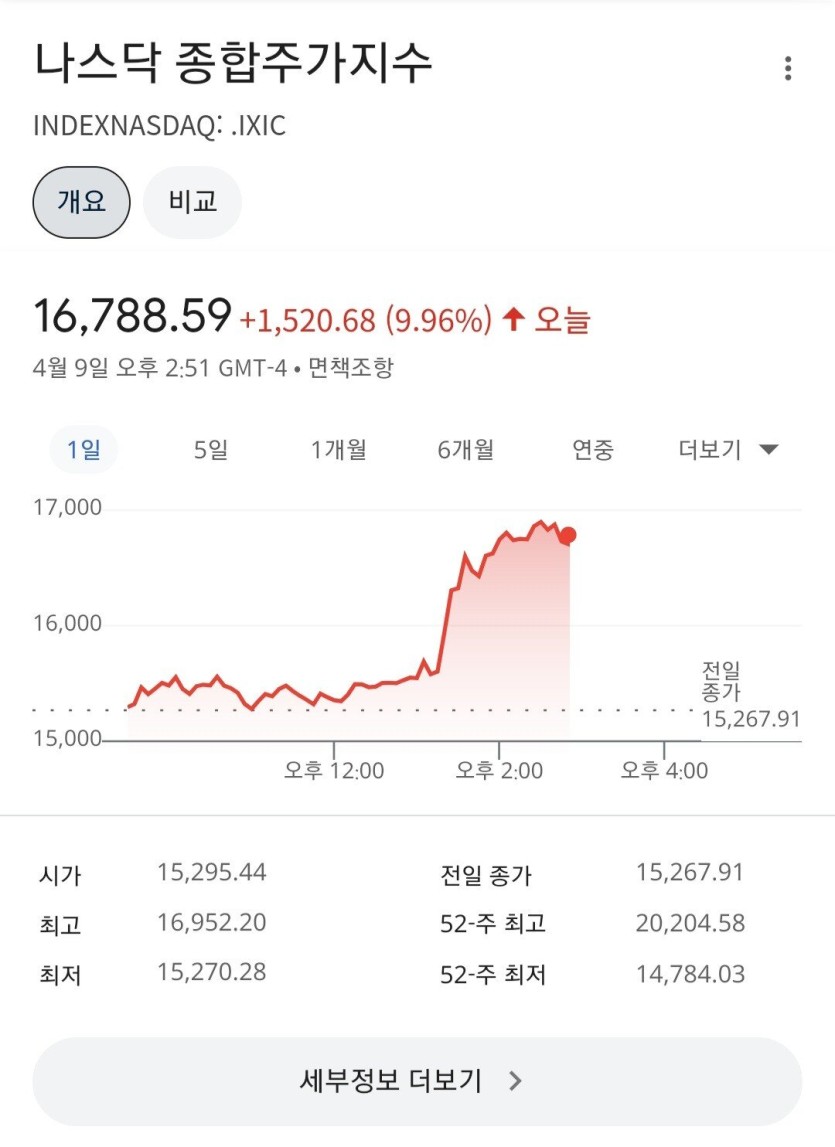 오늘의 트럼프식 SNS 리딩방 rh1 0 101 0 2025.04.10 13:30 다 잘 될 거야, 그러니까 니네들은 진정하고 형 말대로 미국 주식 사라 그로부터 4시간 뒤... 중국에는 관세 125% 즉시 적용하고 나머지 나라들은 일단 90일간 관세 10% . . . . . "미국 증시 떡상" 주식 사라고 미리 말해놓고 딱 4시간 뒤에 떡상시킨 트럼프식 리딩방 0