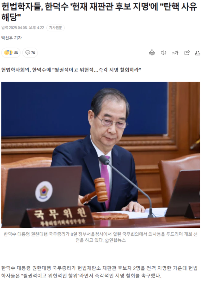 헌법학자들, 한덕수 '헌재 재판관 후보 지명'에 "탄핵 사유 해당"