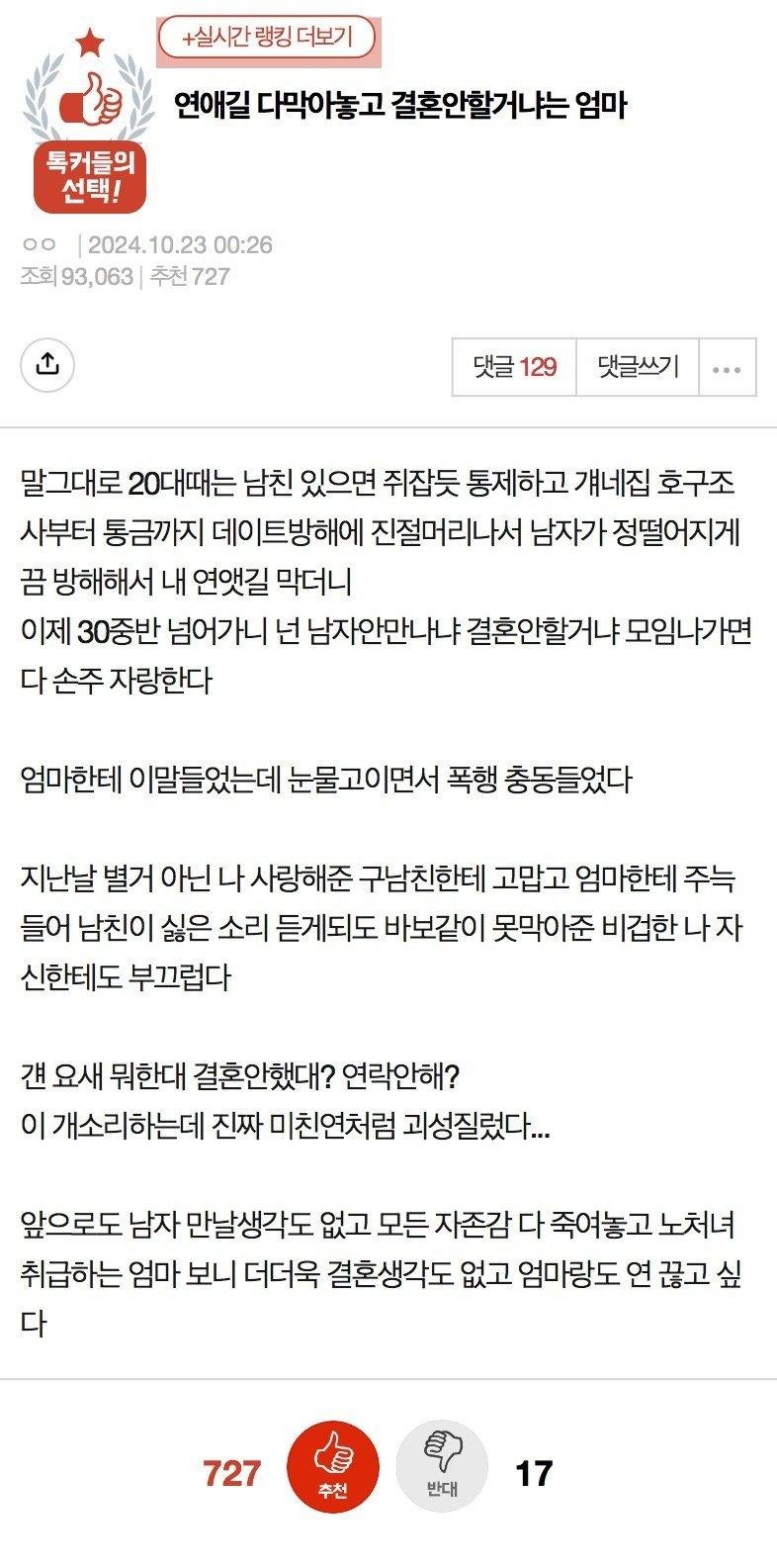 그동안 남친 만나는거 통제해놓고 결혼 언제 할거냐는 엄마