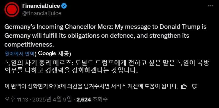 속보)독일:트럼프야 우리 국방 강화할게 rh1 0 298 0 2025.04.10 08:45 (하수) 우리 국방 부담 우리가 질 테니까 관세 협상할래?(씹고수) 게르만족의 혼을 다시 불태울때가 왔다 0