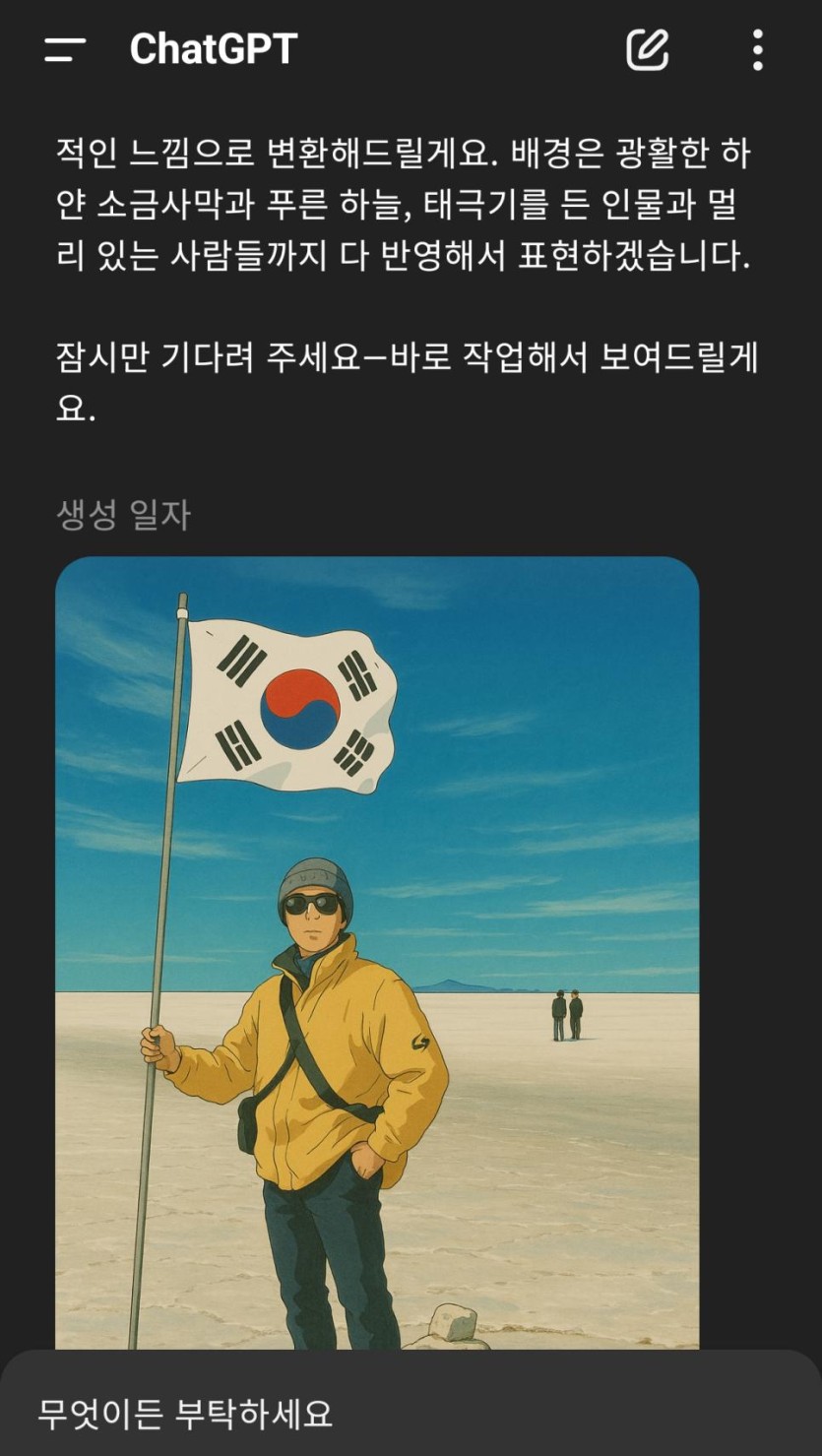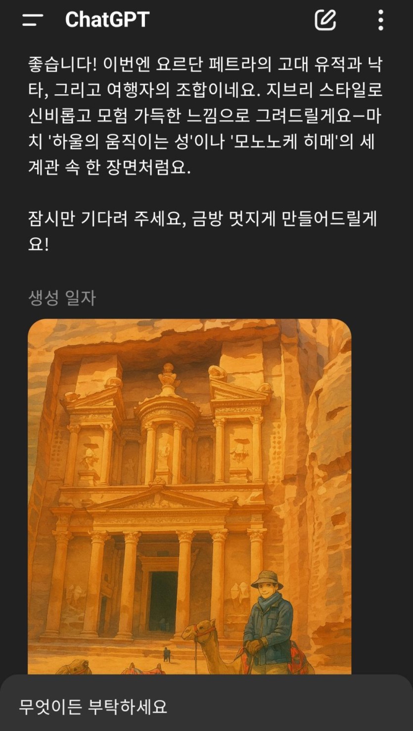 우유니 소금사막, 페트라 rh1 0 196 0 2025.04.10 04:45 쳇gpt가 이렇게 친절하고 따뜻했나요와 그림도 너무 멋지고 멘트가 너무 따뜻해가지고 소녀감성에 빠져버렸네요 ㄷㄷ 사진 계속 달라네요 몇장째 지금 서너개만 해주더니 열풍이 식었나 한가한가 보네요 0