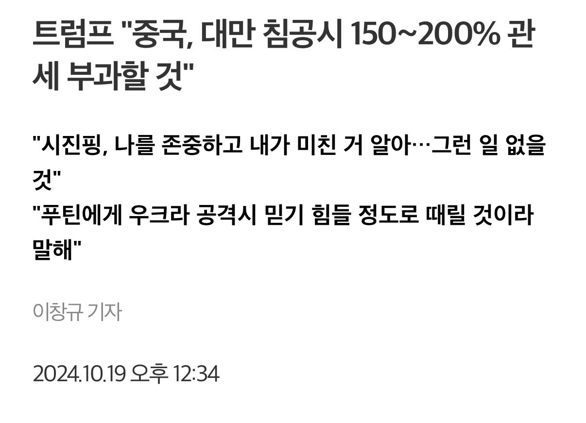 사실상 미국은 대만침공을 용인한 수준 rh1 0 91 0 2025.04.10 00:15 트럼프가 대선기간에 중국이 대만 침공하면 관세 200% 때린다고 공언함 근데 오늘 좆도 아닌 이유로 관세 104% 때렸음 트럼프가 주장해왔던 관세로 중국의 대만 침공 억제한다 << 개소리 됨 0