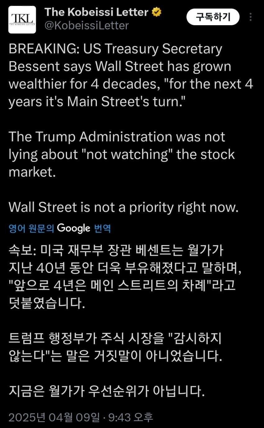 미 재무장관, "월가는 그동안 어지간히 많이 해먹었다. rh1 0 91 0 2025.04.09 22:45 월가를 빨갱이 취급이나 다를바 없는 말을 하다니 ㄷㄷㄷ최악의 경우엔 내전 나겠는데 ㄷㄷㄷㄷ 0