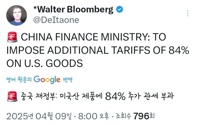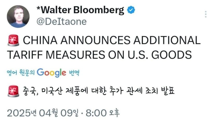 속보) 중국, 4월10일부터 미국에 84% 추가 관세 발표. jpg