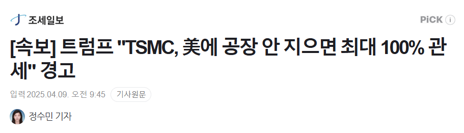 [속보] 트럼프 "TSMC, 美에 공장 안 지으면 최대 100% 관세" 경고