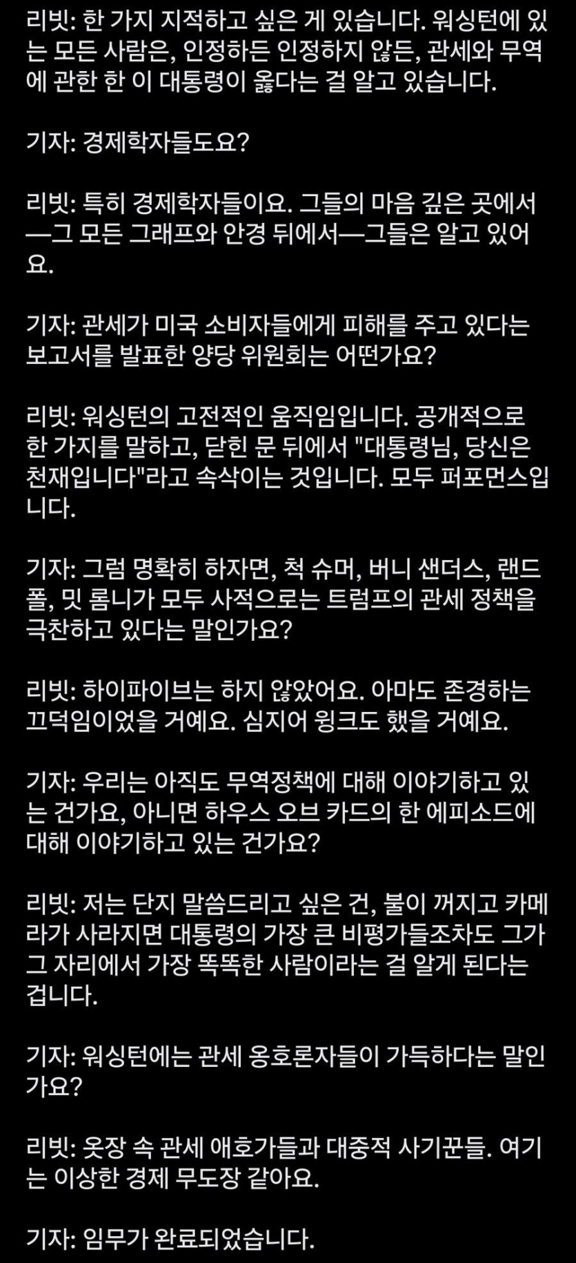 백악관 대변인: "사실 다들 관세 관련 대통령이 천재라고 칭송중이다".jpg