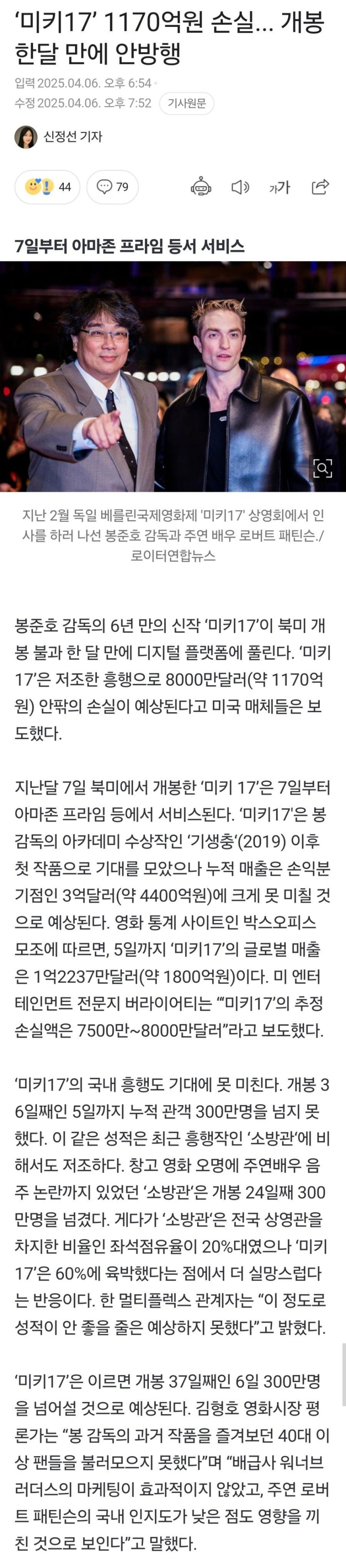 미키17’ 1170억원 손실... 개봉 한달 만에 안방행