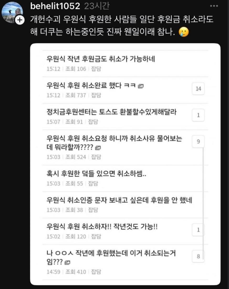현재 우원식 후원 취소 릴레이 ㄷㄷㄷ