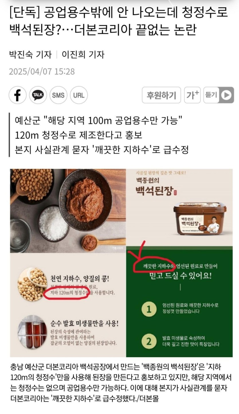 공업용수 밖에 안나오는데 청정수로 만들었다는 백종원 백석된장 rh1 0 91 0 2025.04.08 20:15 출처 : https://m.asiatoday.co.kr/kn/view.php?key=20250407010004004 0