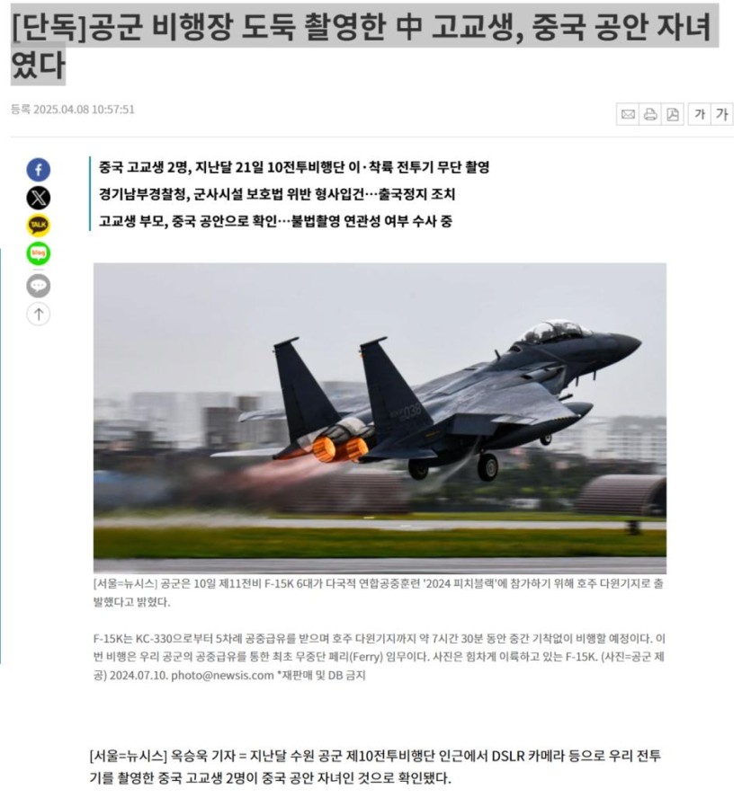 [단독]공군 비행장 도둑 촬영한 中 고교생, 중국 공안 자녀였다
