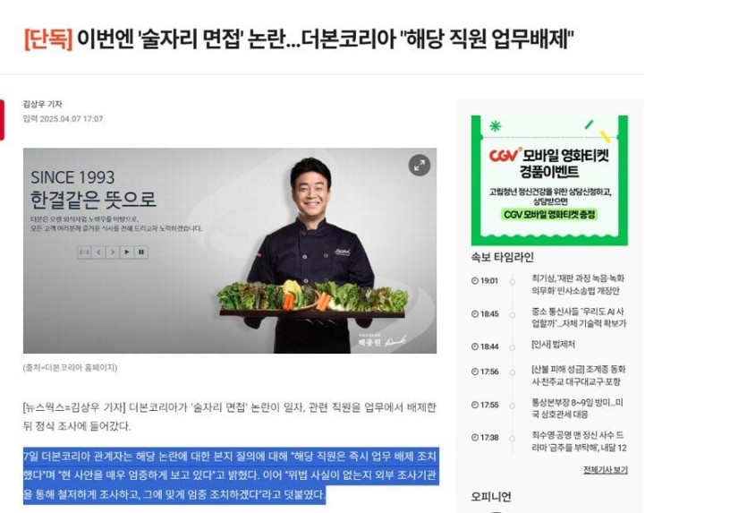 술자리 면접 더본코리아 반응 뜸