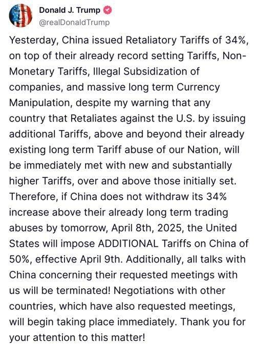 어제 중국은 이미 기록적인 관세에 더해 34%의 보복 관세, 비화폐 관세, 불법적인 기업 보조금, 그리고 대규모 장기 통화 조작을 부과했습니다. 이에 대해 경고했듯이, 미국에 보복하는 어떤 나라도 이미 오랜 기간 지속된 우리 나라에 대한 관세 남용을 넘어 추가적인 관세를 부과하면, 즉시 새롭고 상당히 더 높은 관세로 대응받게 될 것입니다. 따라서 중국이 34%의 추가 관세를 철회하지 않는다면, 2025년 4월 8일까지 미국은 중국에 50%의 추가 관세를 부과할 것입니다. 4월 9일부터 중국과의 모든 협상은 종료될 것입니다! 또한 회의를 요청한 다른 나라들과의 협상도 시작될 것입니다. 이 문제에 관심을 가져주셔서 감사합니다!