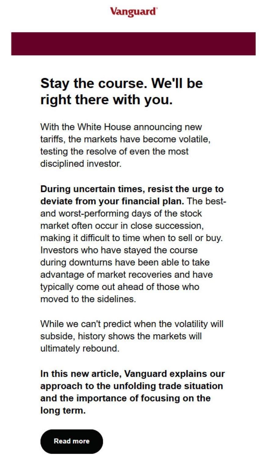 "흔들리지 마세요. 저희가 함께 하겠습니다. 백악관이 새로운 관세 부과를 발표하면서 시장은 불안정해졌고, 가장 철저한 투자자의 인내심마저 시험에 들게 하고 있다. 이처럼 불확실한 시기에는 재정 계획에서 벗어나고 싶은 유혹을 이겨내는 것이 중요하다. 하락장에서도 꾸준히 투자를 유지한 투자자들은 시장 회복의 혜택을 누릴 수 있었고, 시장에서 물러나 있던 투자자들보다 일반적으로 더 나은 성과를 거뒀다 우리는 변동성이 언제 잦아들지 예측할 수는 없으나, 역사적으로 시장은 결국 회복돼 왔다