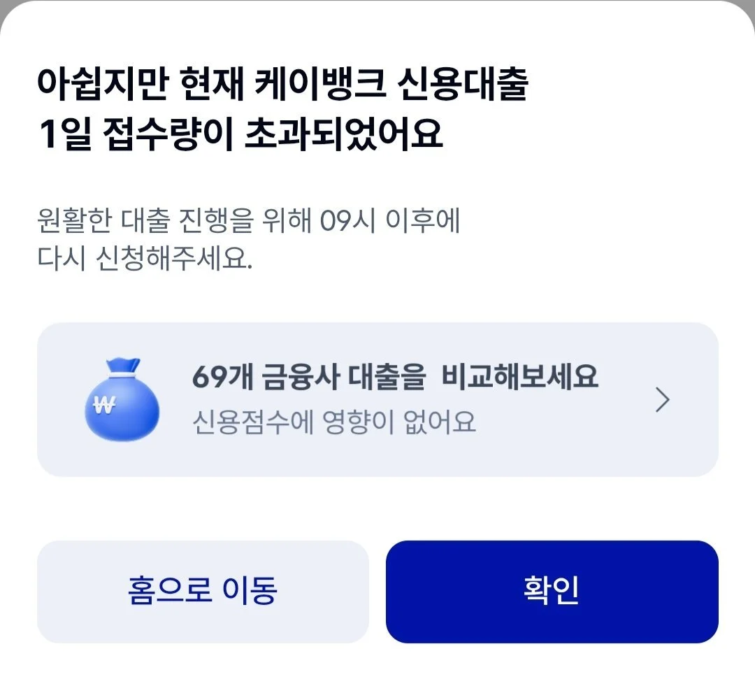케이뱅크 신용대출 일일접수량 초과