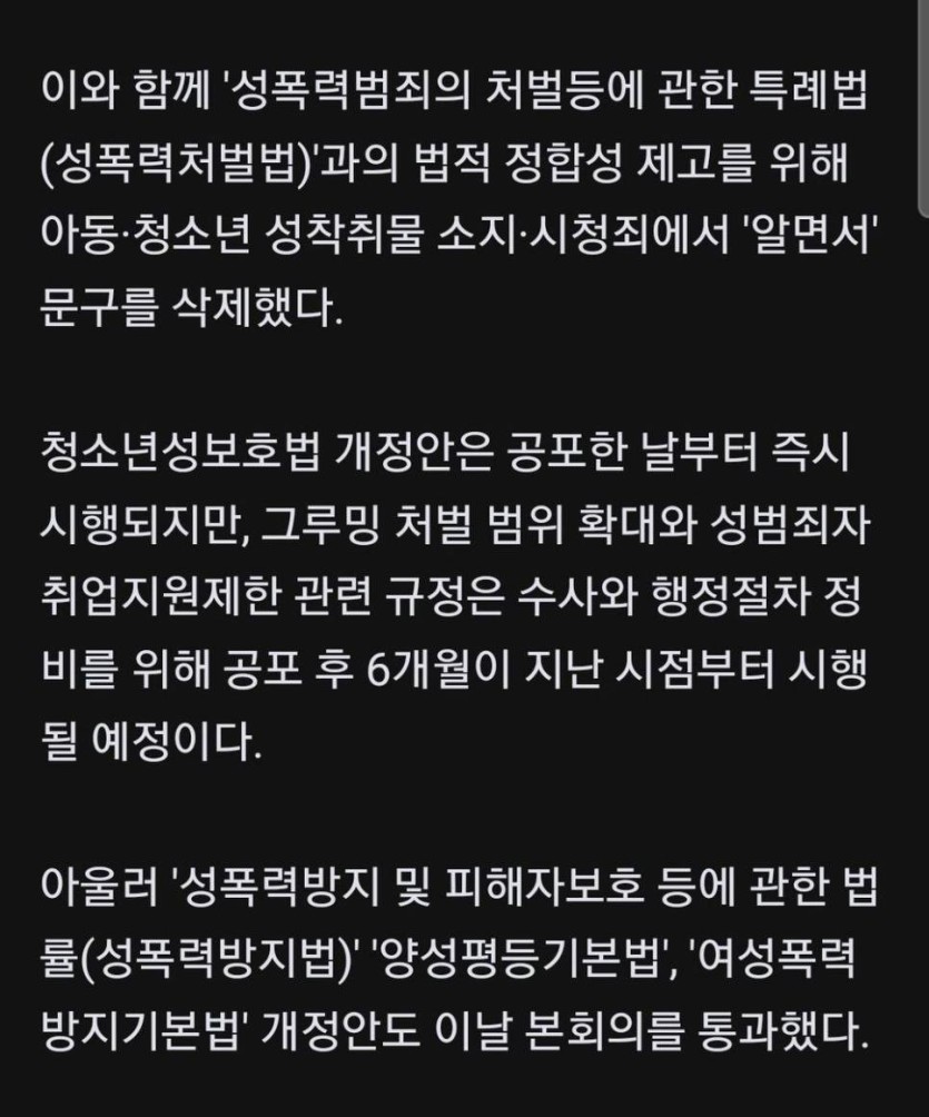 심각) 아청법 근황 rh1 0 121 0 2025.04.07 20:45 소지 시청시 아청물인걸 '알면서' 소지, 시청했을 경우 처벌이였는데저 '알면서' 를 빼면서 고의성이 없더라도 처벌할 수 있도록 개정됨.누가 님 조질라고 아청물 보내도 그걸로 님이 처벌 받을 수 있는 근거가 생겨버림.디지털로 암살 씹가능 0