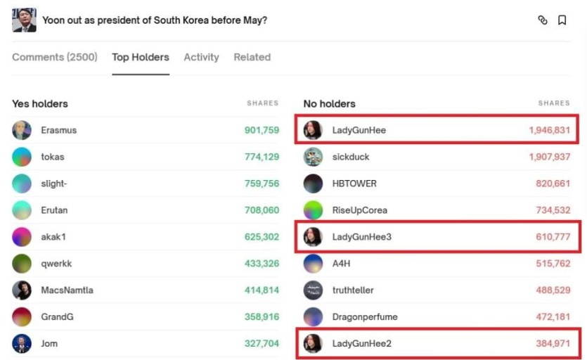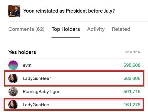 윤 탄핵 기각에 20억 몰빵한 사람 ㄷ..jpg rh1 0 365 0 2025.04.07 08:15 지난 달 폴리마켓(여러가지 주제로 판 돈을 거는 사이트)에서"3월 내 윤석열 탄핵이 된다 안 된다"에서 안 된다에 몰빵을 해서 14억 정도를 번 걸로 알려져 있음 이번에도 여지없이 5월 내 윤석열 탄핵 안 된다에 부계정까지 돌려서 20억 이상 몰빵함 거기도 모자라 7월 내 윤석열 복권한다에 1억 넘게 걸었음. 그리고 그 결과는?? 완전 망함.. 0