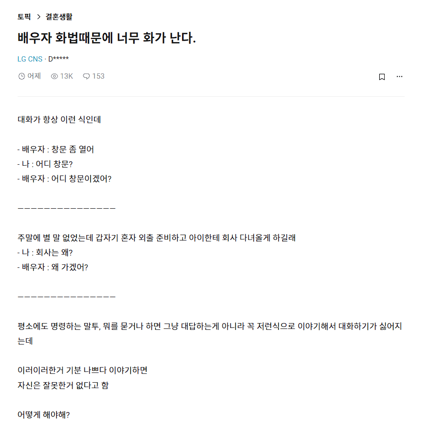 배우자 화법때문에 너무 화가 난다는 아내.blind