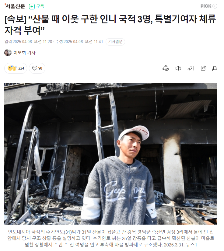 산불 덮친 영덕서 수십명 구한 외국인 근황 rh1 0 170 0 2025.04.06 16:15 산불 때 주민 수십명 구한 인도네시아인 3명 예상대로 체류자격 부여됨 산불 덮친 영덕서 수십명 구한 외국인 근황 0