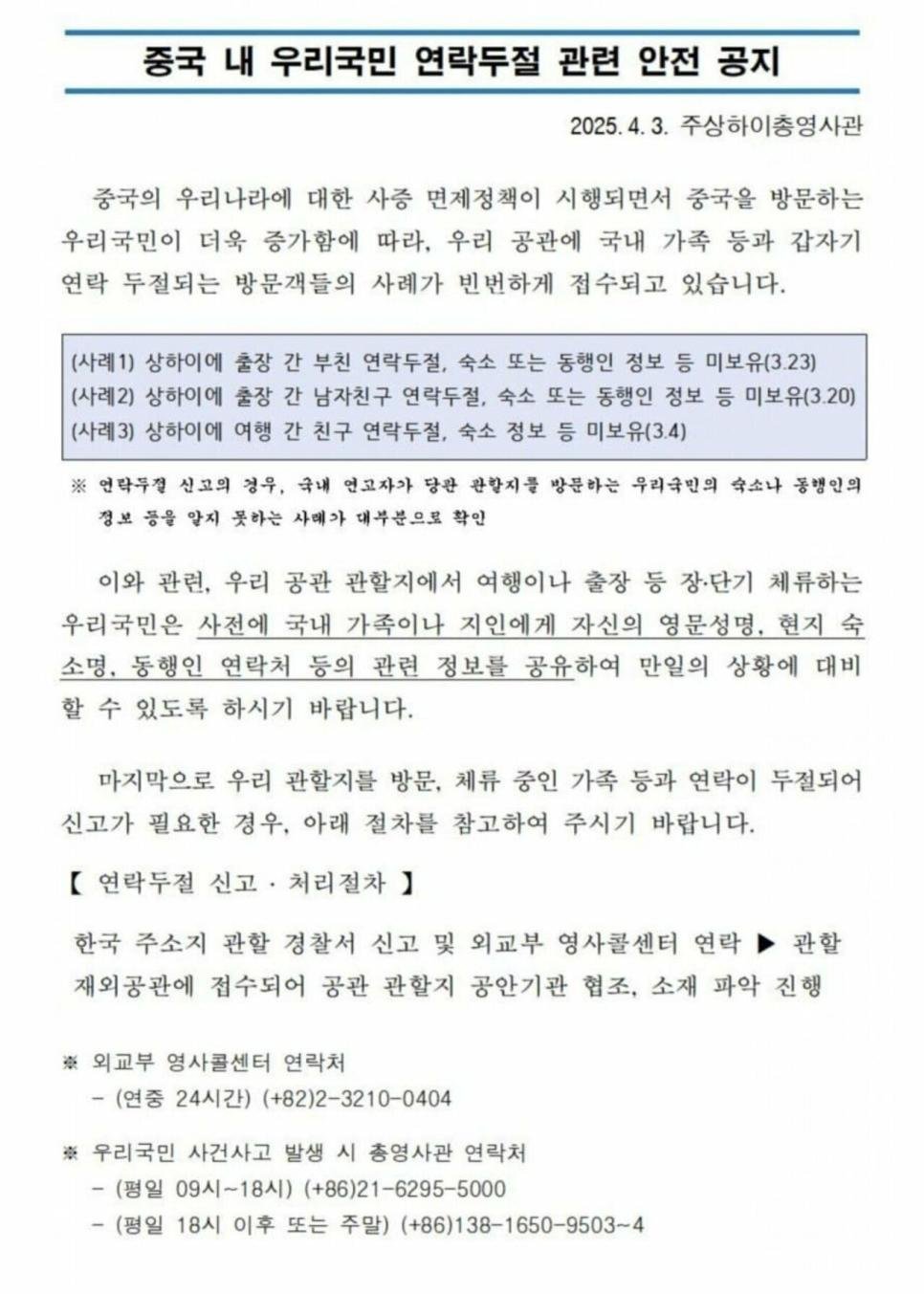 중국 내 우리국민 연락두절 관련 안전 공지