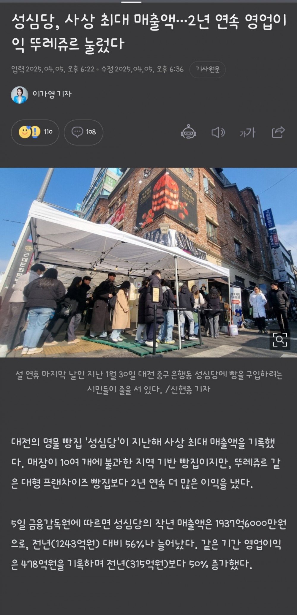 성심당, 사상 최대 매출액…2년 연속 영업이익 뚜레쥬르 눌러