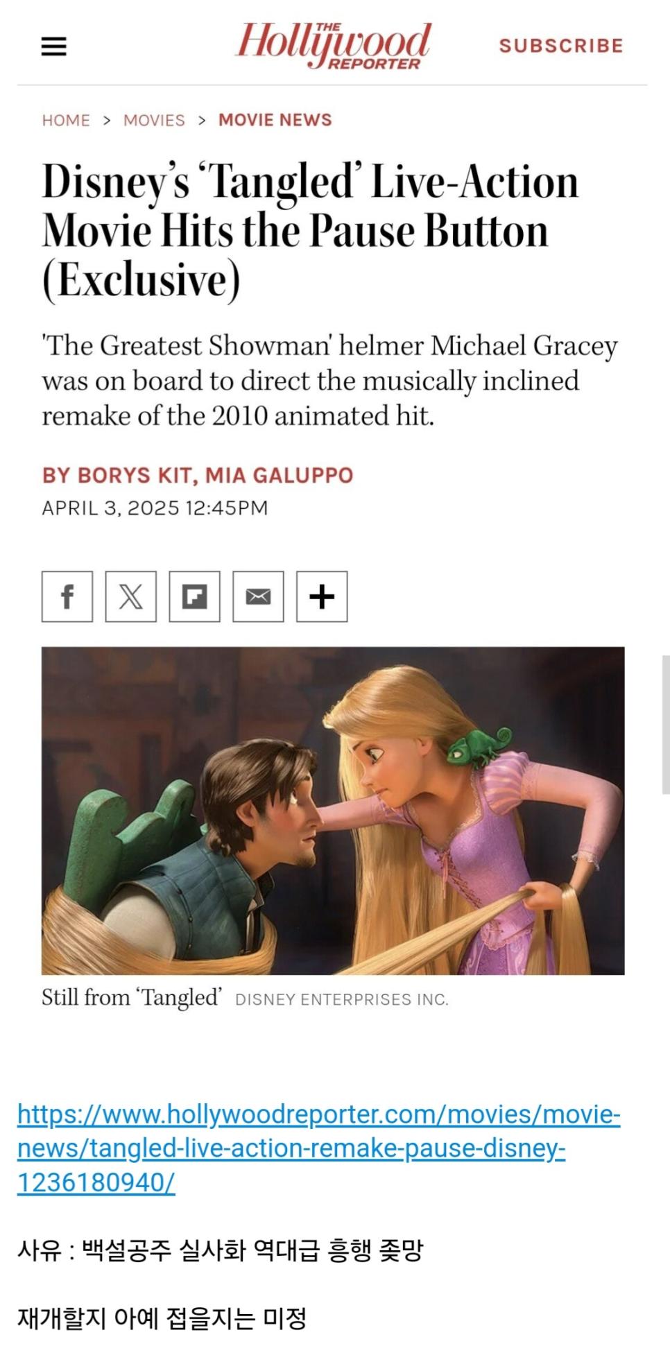 디즈니 백설공주 흥행 참패에 라푼젤 실사화 취소