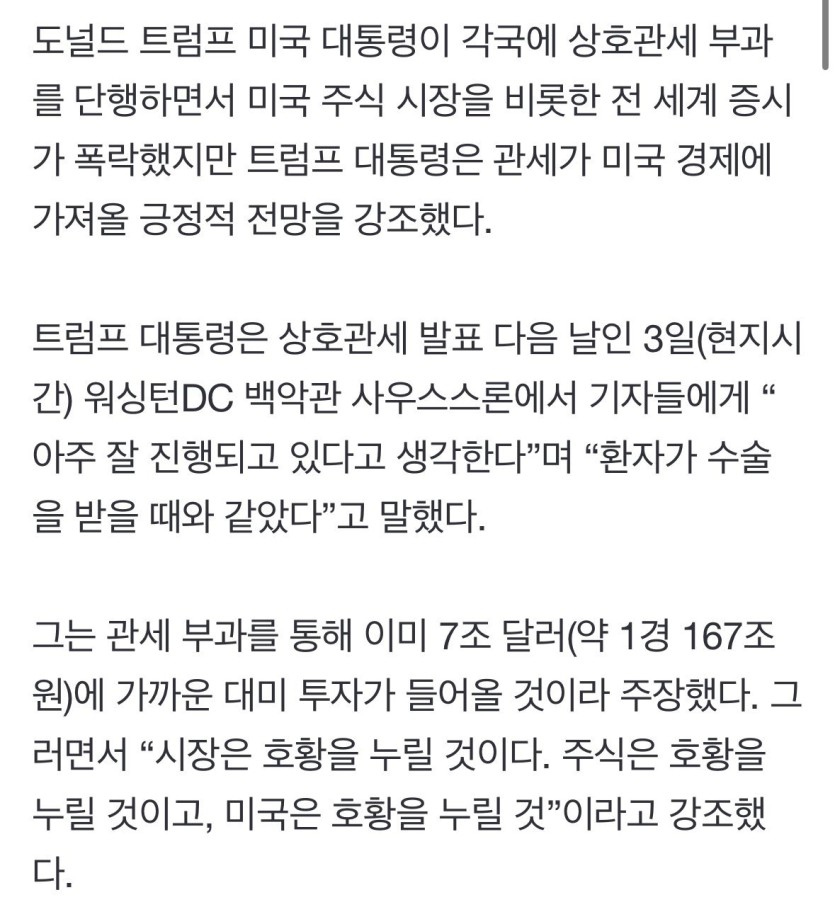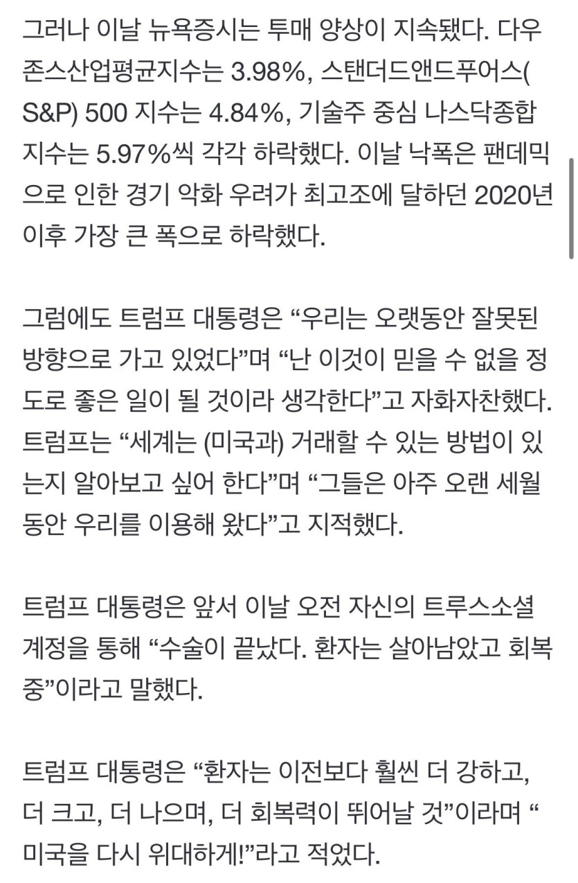트럼프 “수술 끝났다, 시장 호황 누릴 것” rh1 0 237 0 2025.04.04 13:45 https://naver.me/G2EuaaHi 상호관세 발표 후, 나스닥 등등 미국 주식시장 그그그그급락에 대해 언급하며.. (속쓸은 마삼십퍼 ㄷㄷ) 수술 안해도 되는데, 굳이 개패서 수술하게 만든건 아니고? 0