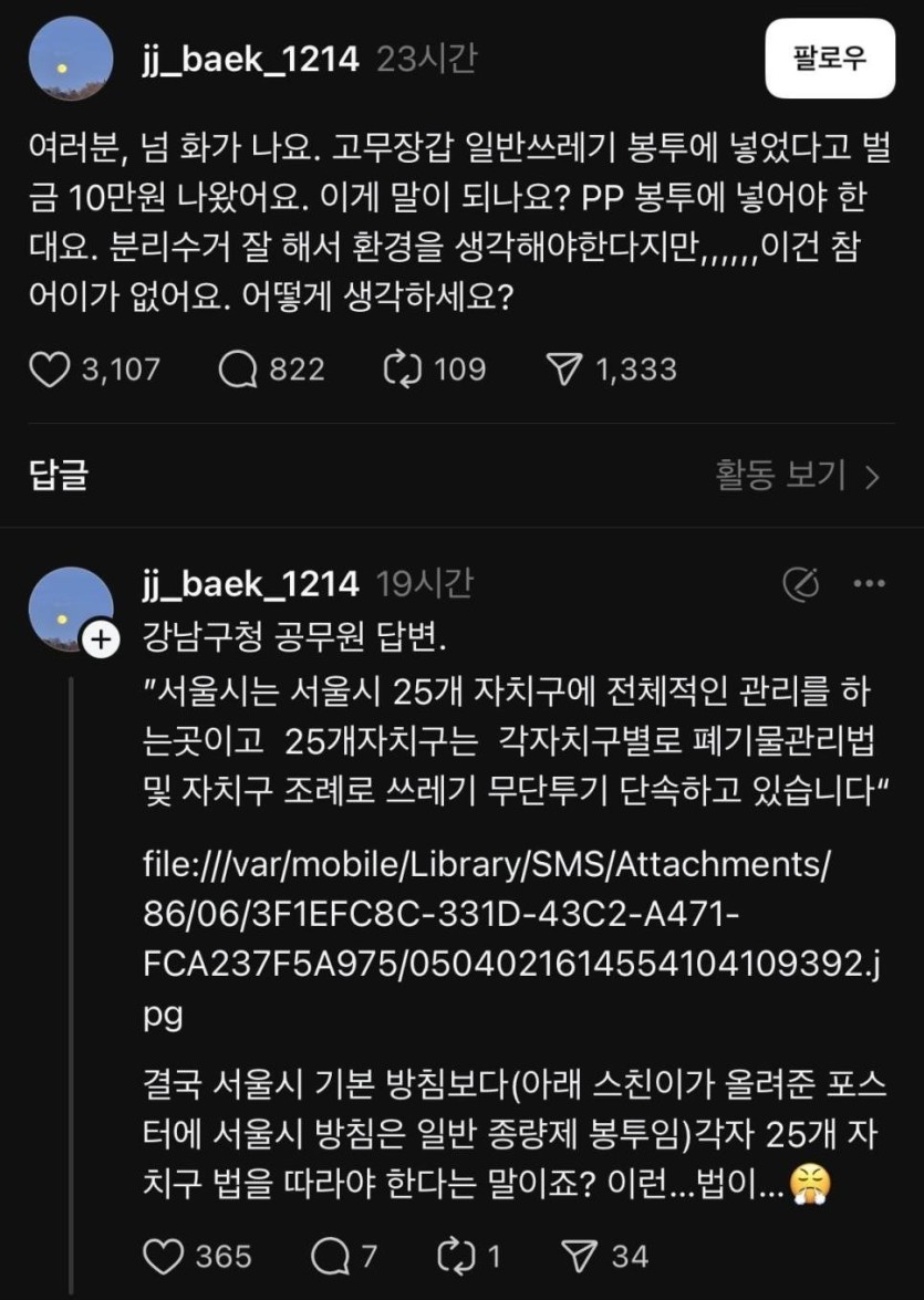 고무장갑 일반쓰레기로 버리면 벌금 10만원