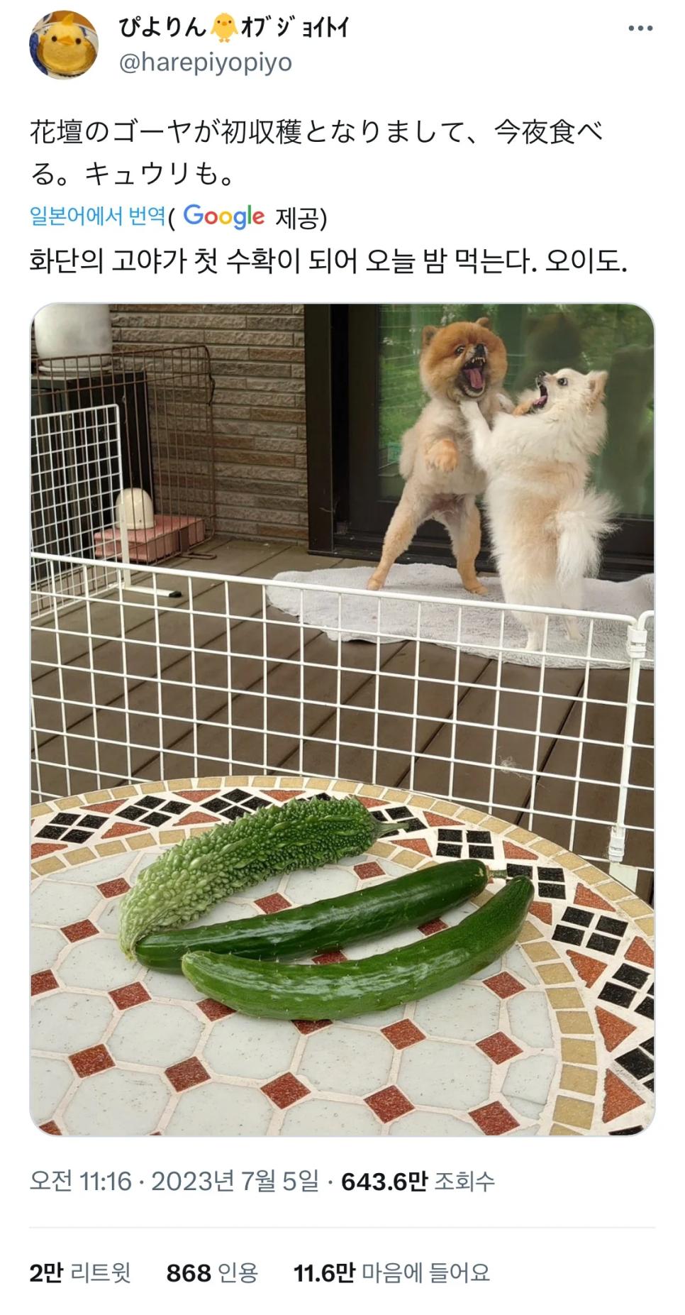 오이를 찍었을뿐인데 수상할정도로 화제인 트위터 rh1 0 232 0 2025.04.03 23:00 그냥 텃밭에서 오이를 첫수확할 내용일 뿐인데뒤에 댕댕이들이 너무 야성적으로 싸워서 화제(흰개는 옆집에서 놀러온 개라고 함) 그리고 사실 사이도 좋다 0